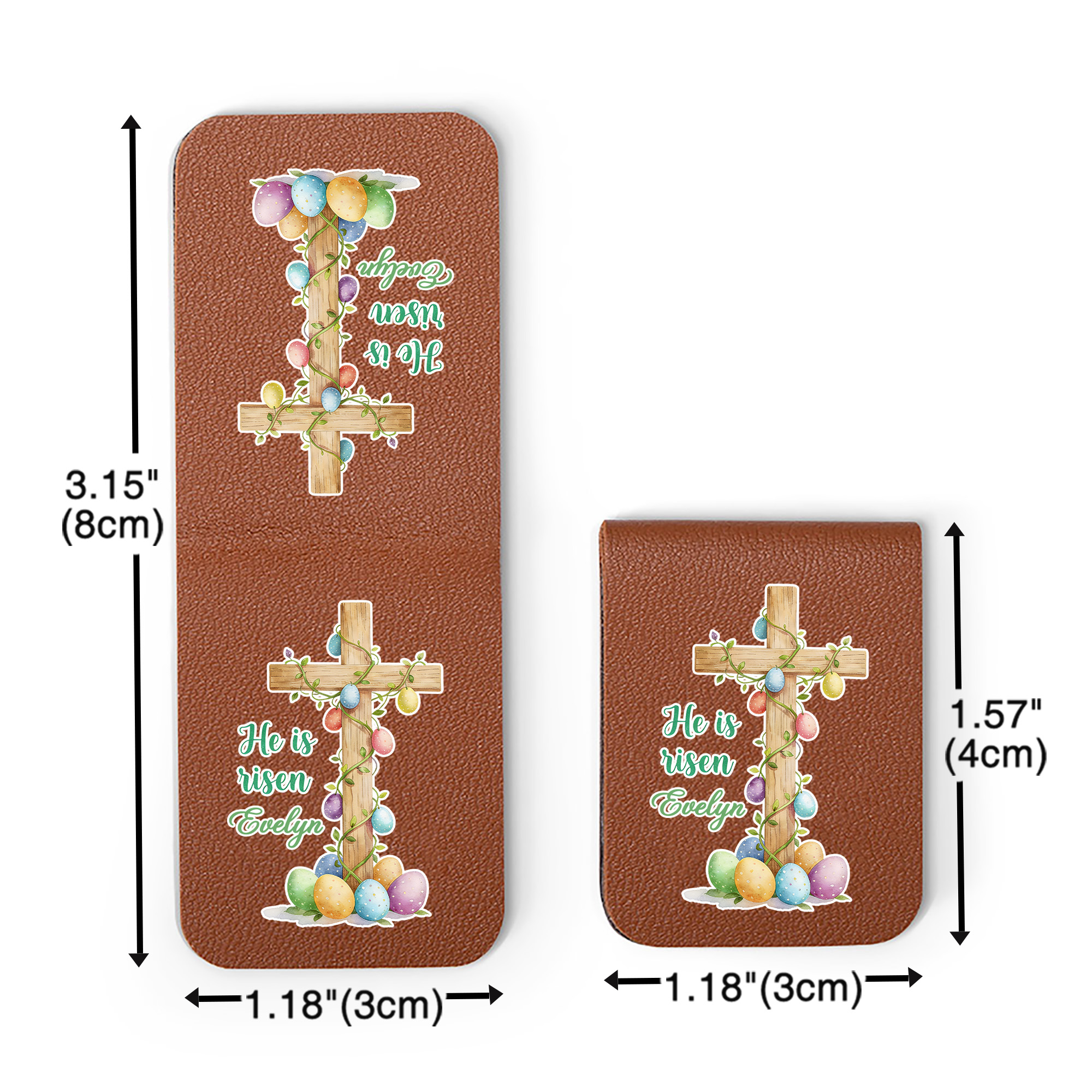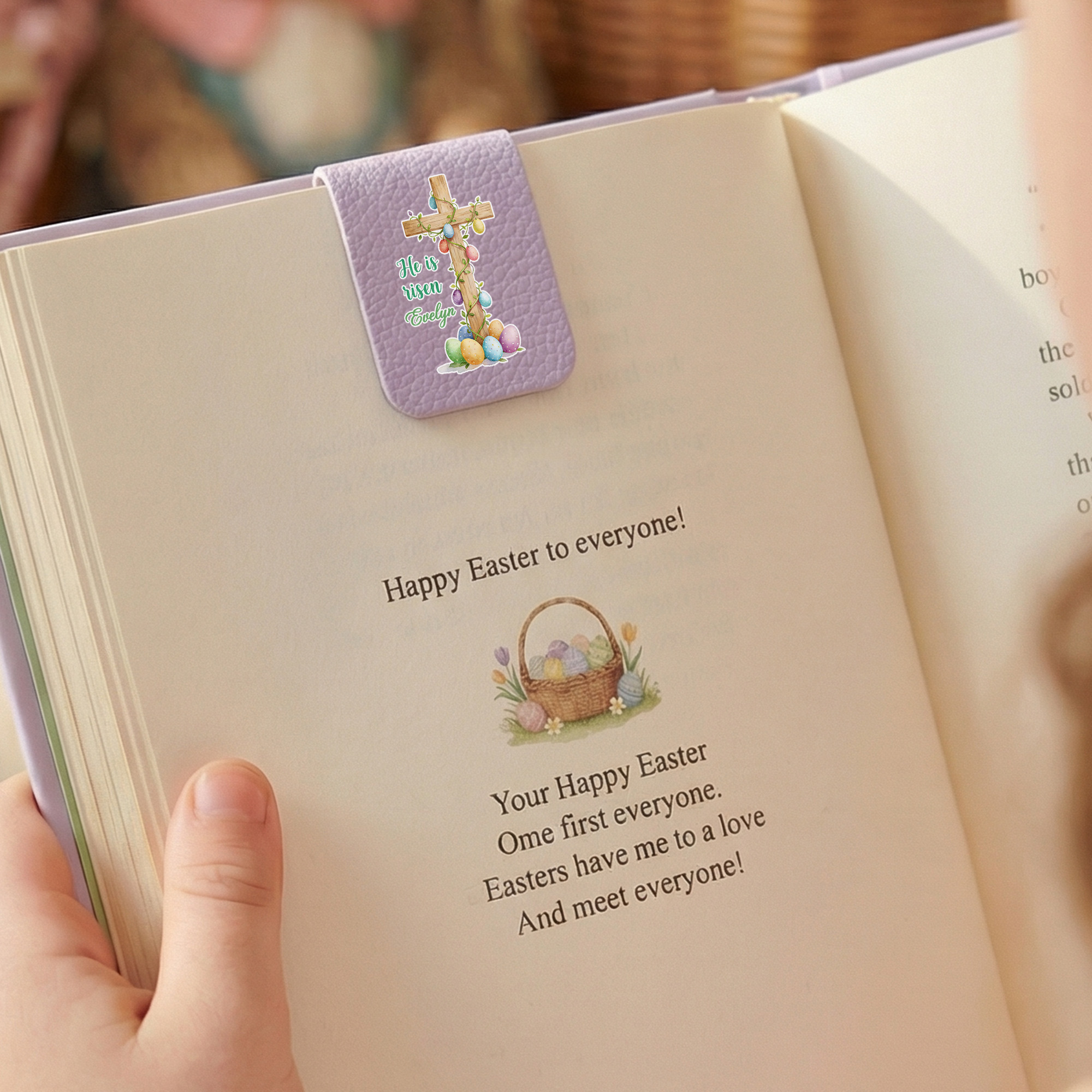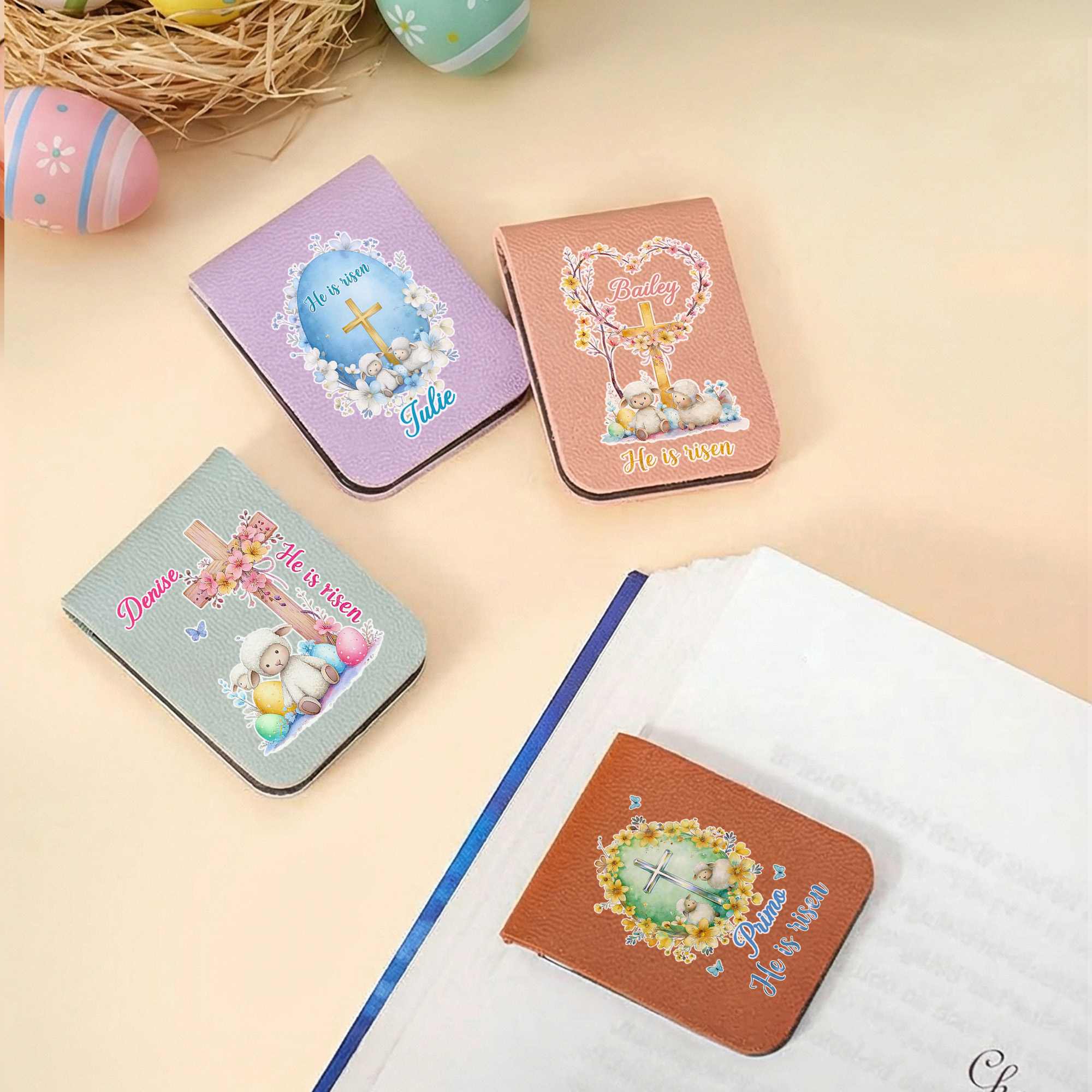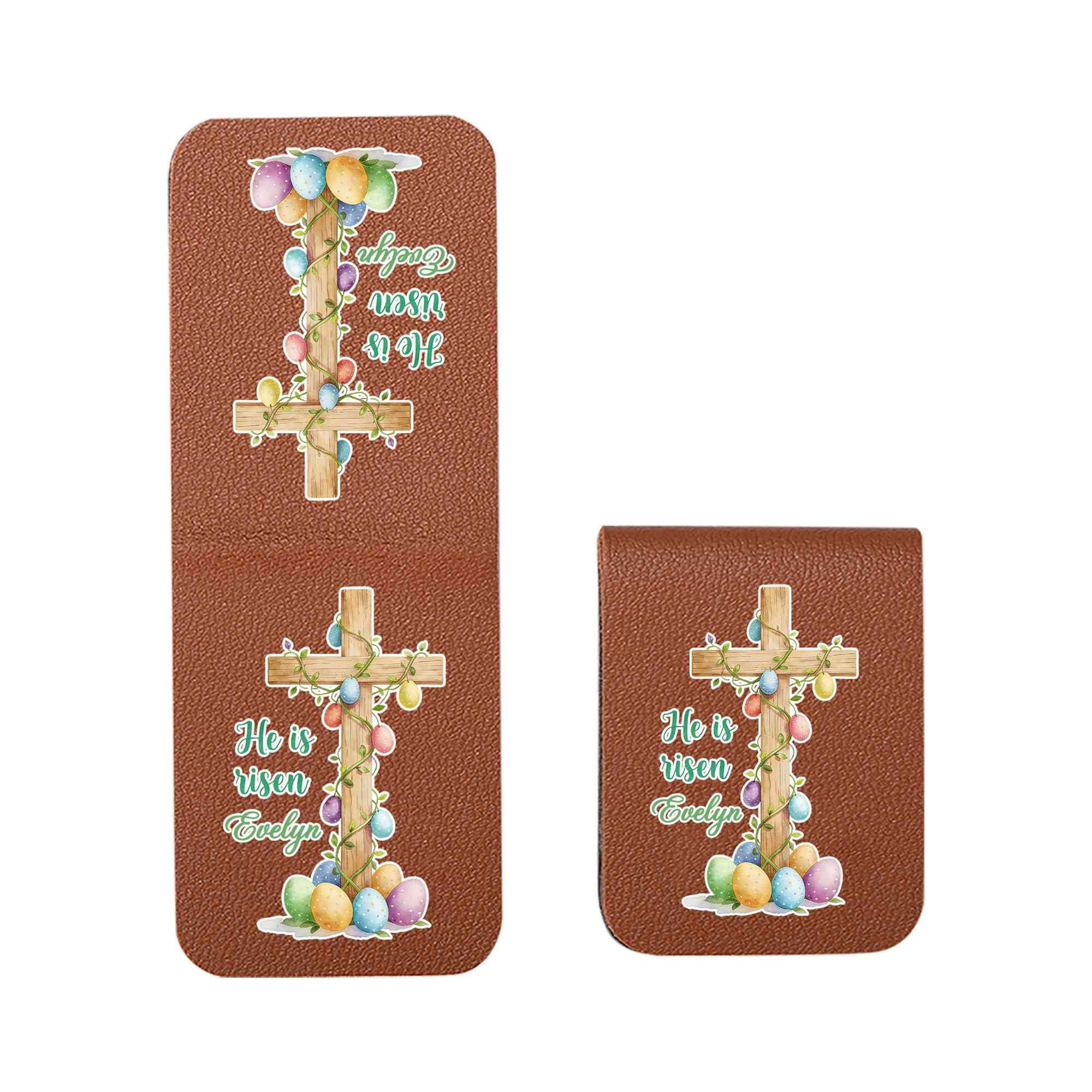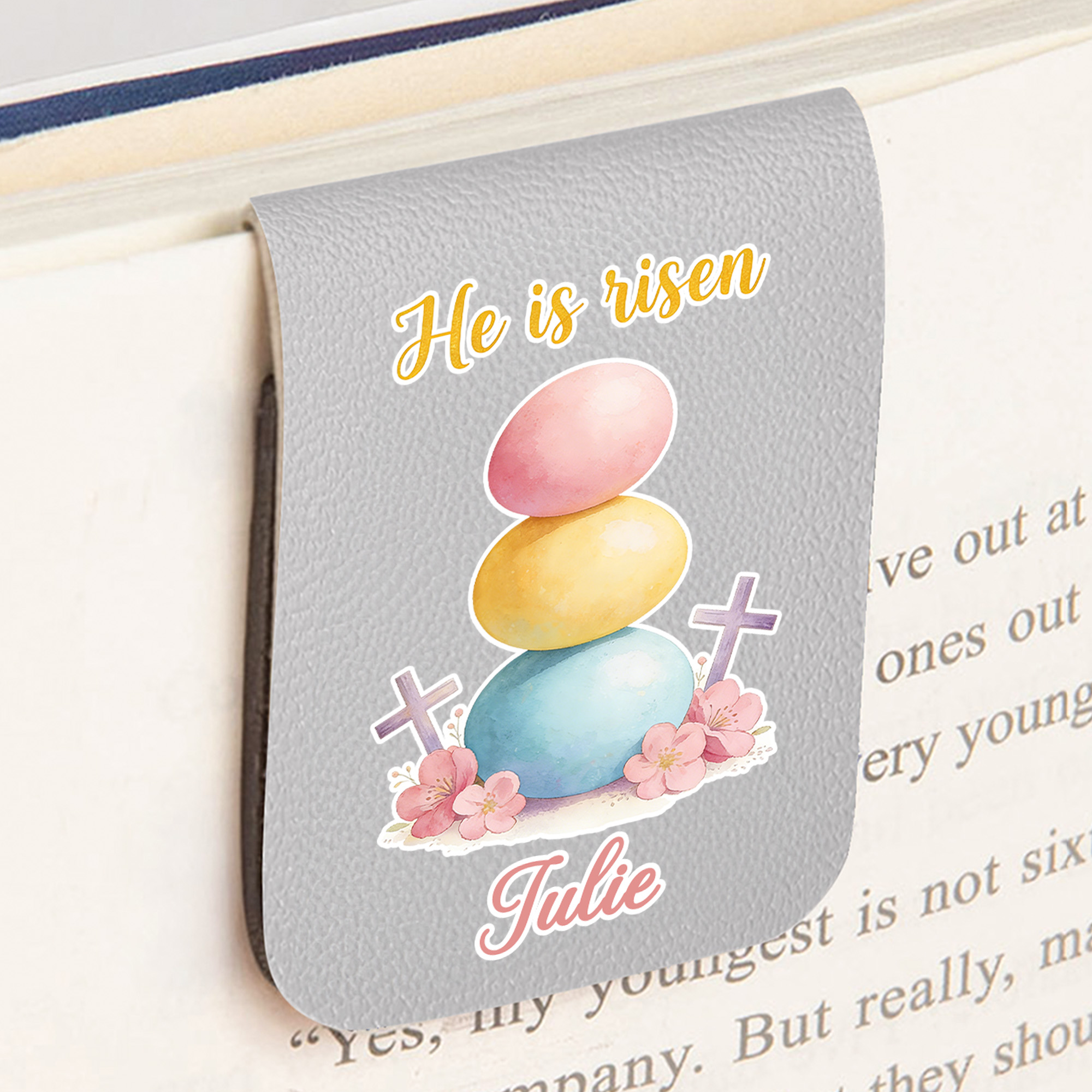 Faith-Inspired Easter Design - This magnetic bookmark features a meaningful Easter scene with a cross, Easter eggs, and gentle sheep, paired with the words “He Is Risen.” The calm, balanced layout brings a sense of hope and faith to daily reading and reflects the true spirit of Easter.