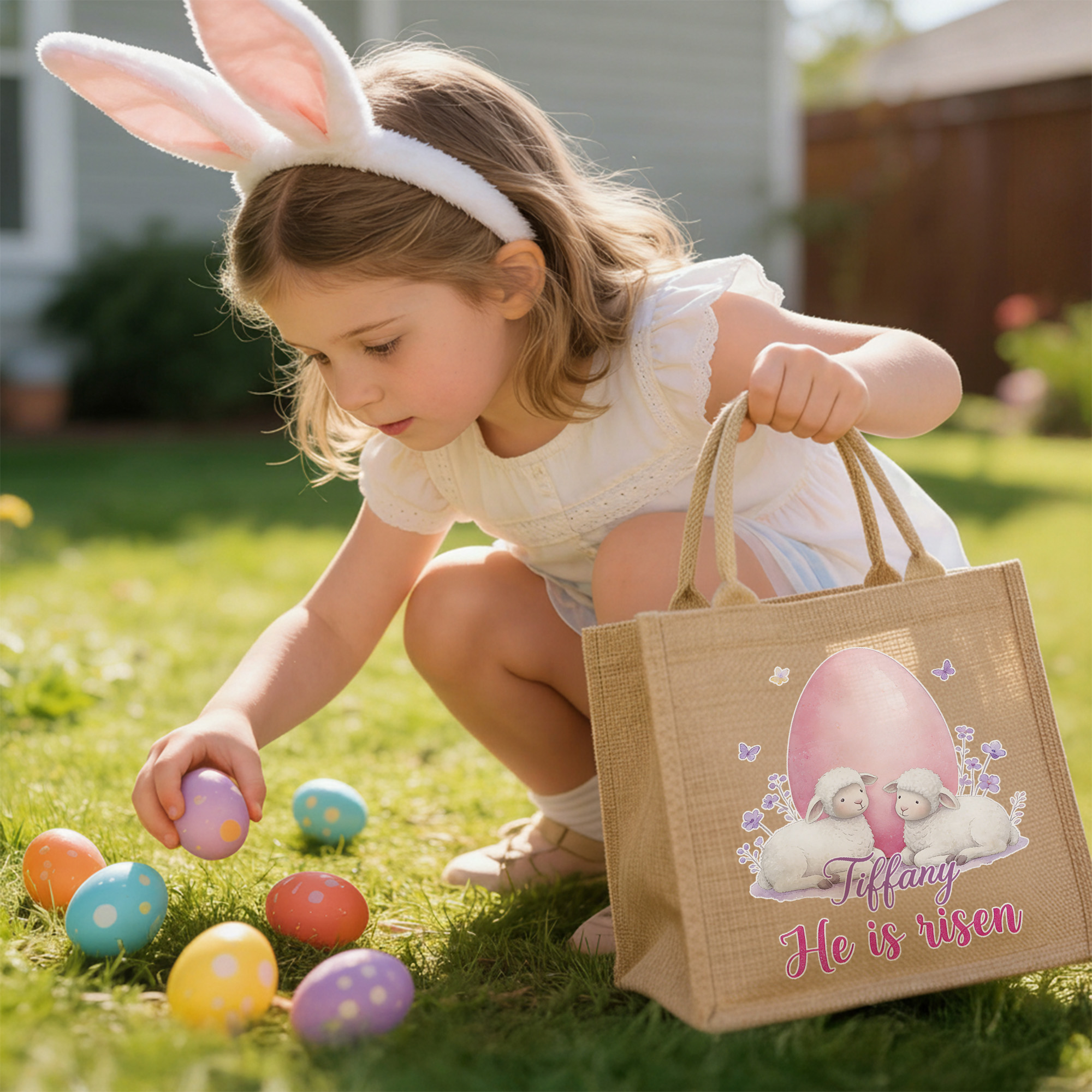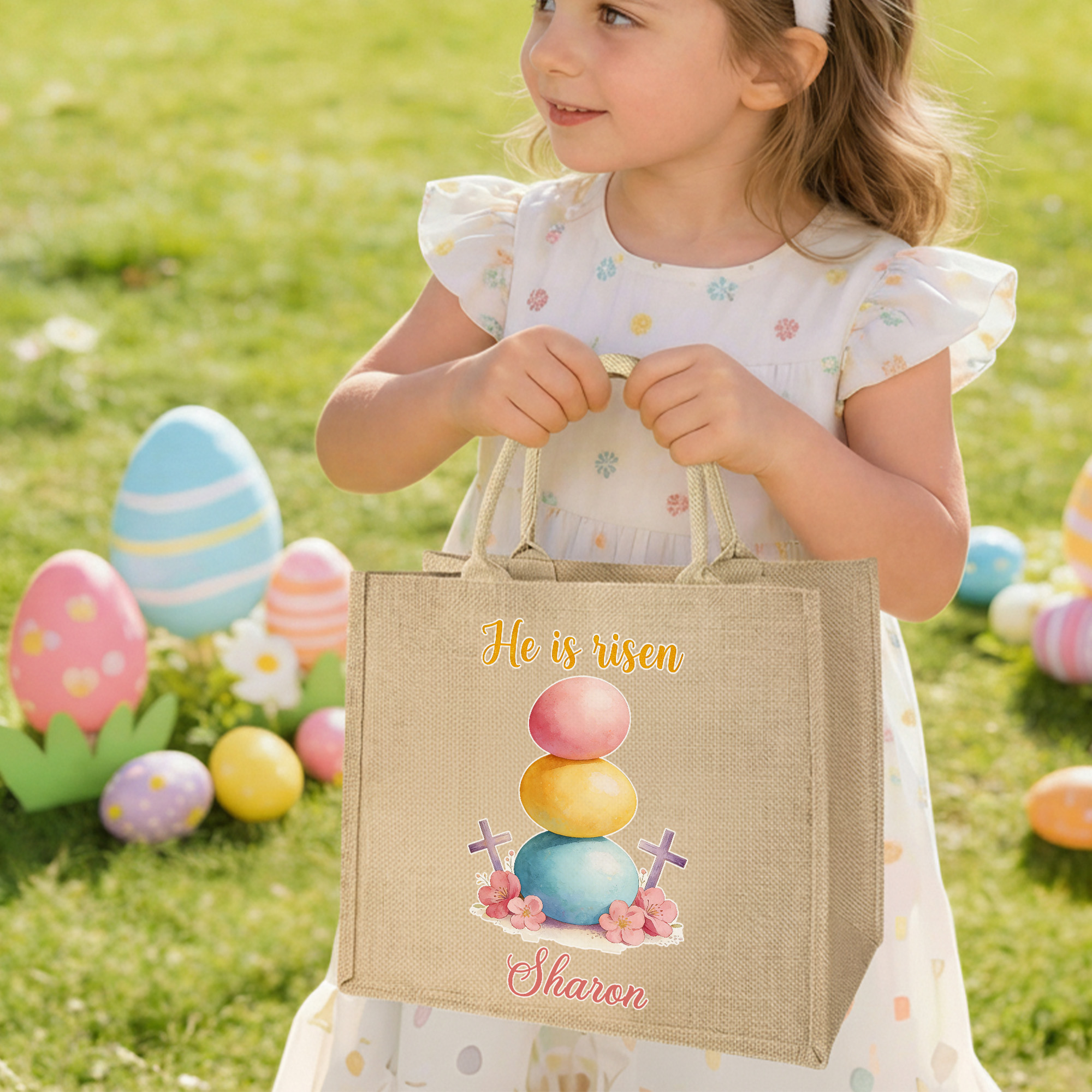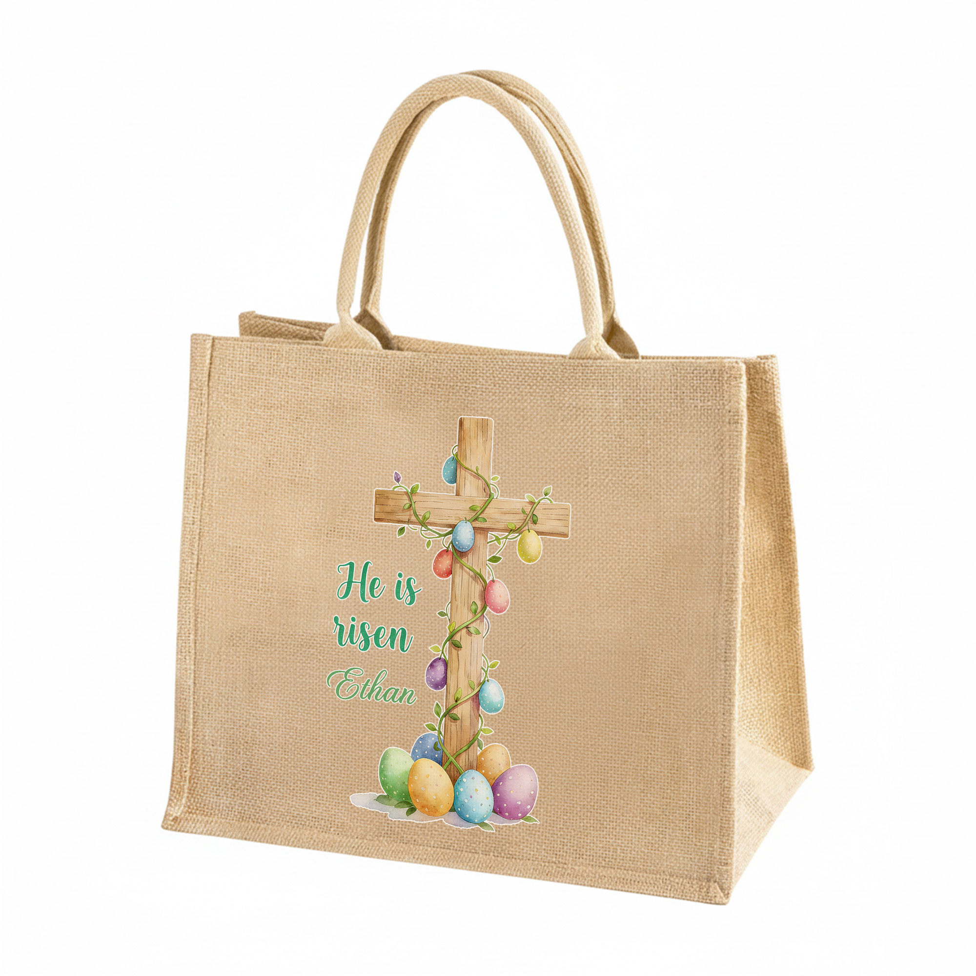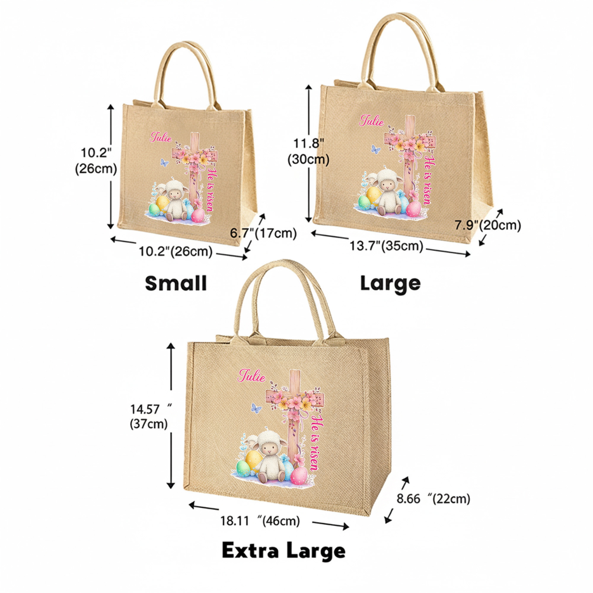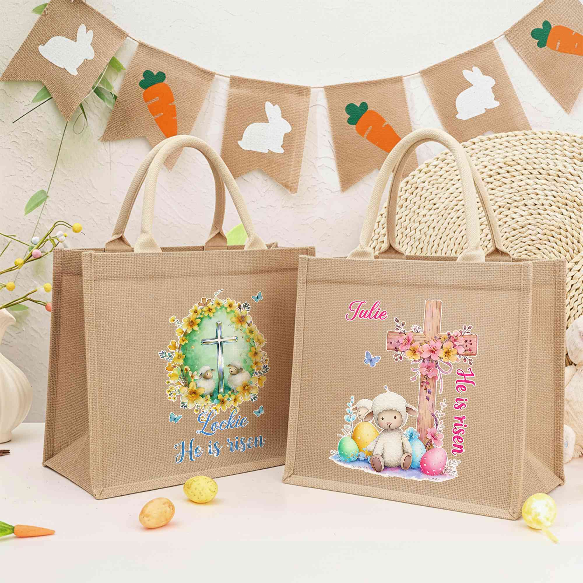 Custom Name Cross Easter Eggs Sheep Design He Is Risen Tote Bag, Large Capacity Easter Egg Hunt Jute Bag, Easter Party Favor, Easter Gift for Kids