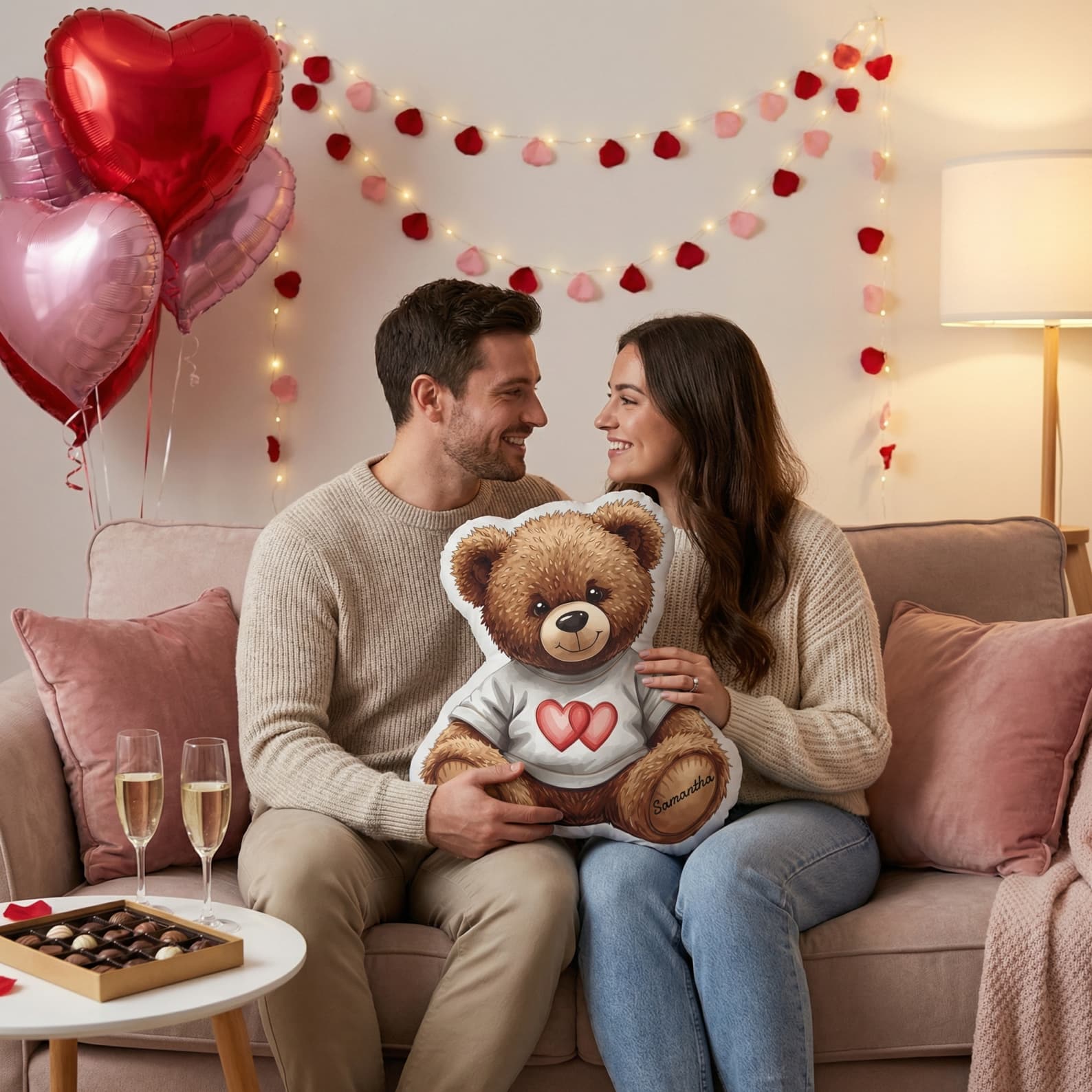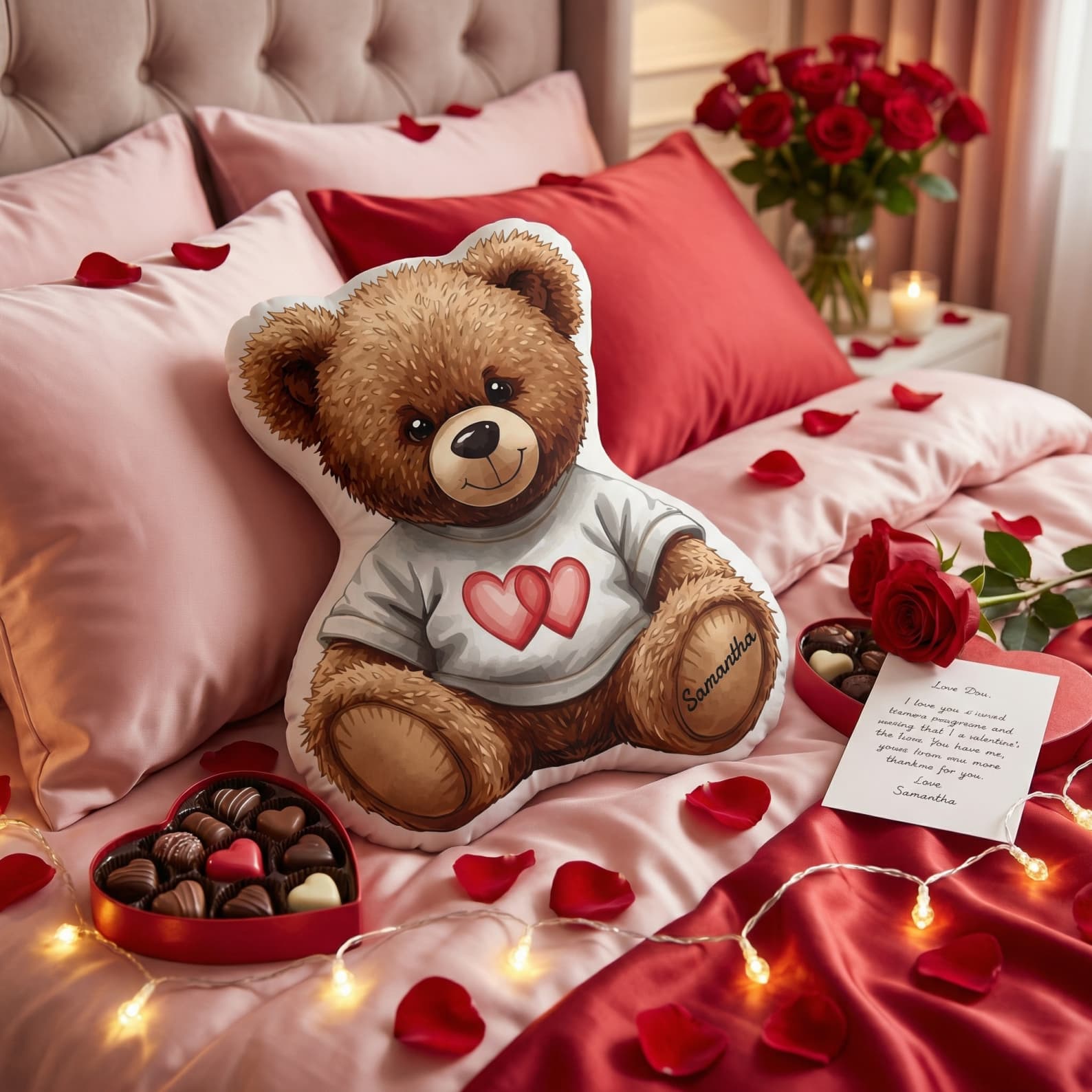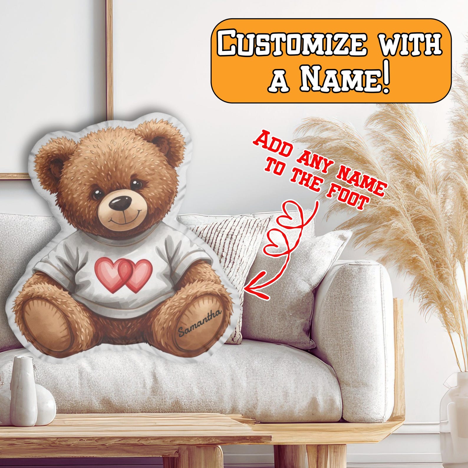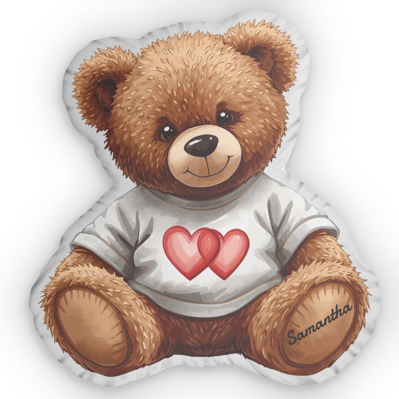 Adorable Sitting Bear Design – This charming plush pillow features a soft, lifelike teddy bear sitting upright in a cozy pose, wearing a white T-shirt adorned with two overlapping red hearts. The bear’s warm brown fur and gentle expression create a sweet, comforting presence—perfect for adding love and charm to any space.